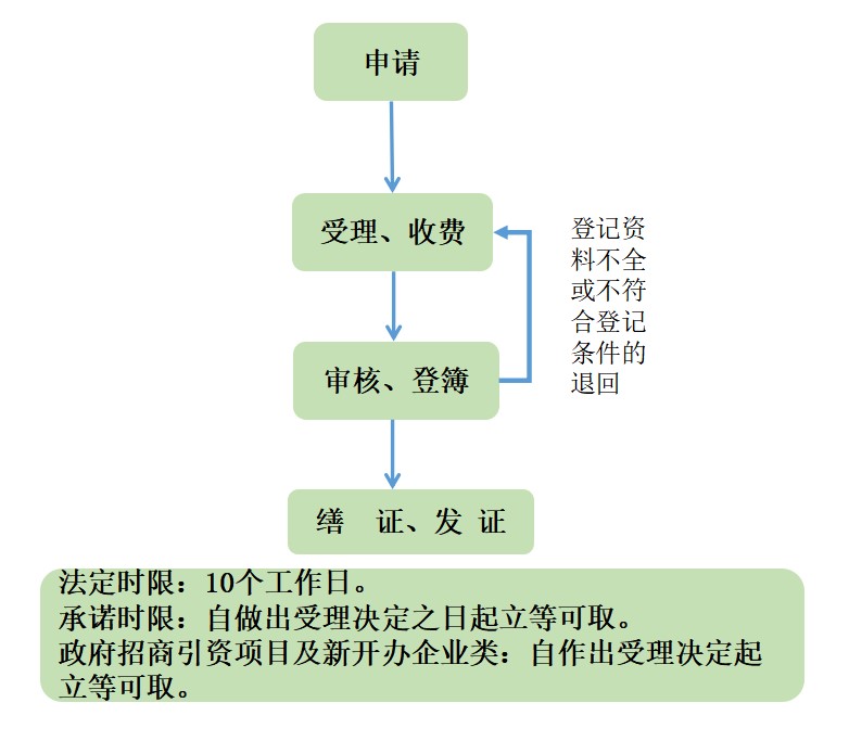 申请受理→审核→记载于登记簿→缮证发证